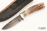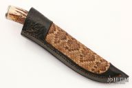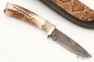 This Hunter by Herb Derr features a Damascus blade with fileworked spine, .150" blade depth and 1.071" blade depth, hidden tang construction. The handle is comprised of a nickel silver guard and pommel with maple burl and nickel silver spacer and a stag grip. Includes a brown leather sheath with snake skin inlay. Excellent condition.