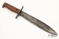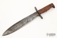 This US Model 1917 Bolo knife by "SA" (please let us know if you know who this makers mark is) is dated 1917. It has a black blade with a sharpened top edge, .232" blade stock and 1.632" blade depth, full tang construction. The handle has a steel guard and butt with wood scales. Has some dings and scratches, has been resharpened, but overall in really good condition for a 100 year old knife.