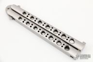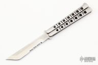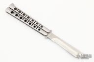 The model 44S by Benchmade is rare and hard to find. Tanto style partially serrated blade with a satin finish. Stainless steel skeletonized handles with T latch. Comes with original box and papers, sheath. Has scuffs and scratches, has been used, otherwise good condition.