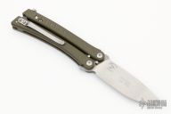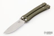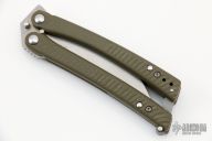 This Model 53 Balisong was designed by Charles Marlowe and manufactured by Benchmade. The blade is composed of tumbled D2 stainless steel. The Handle is a green G10 with a bead blasted titanium backspacer and t-latch. The Tip up pocket clip is composed of stainless steel. Prototype July 2010 on the b-side. Comes with original box and papers, and soft pouch. Excellent condition.