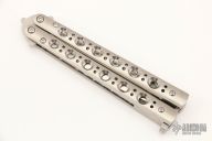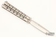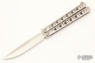 This Model 62 Balisong by Benchmade features a stonewashed spear point D2 blade with a false top edge. The handle has stainless steel handles and latch. Comes with original box and papers and pouch. Prototype March 2012. Excellent condition.