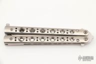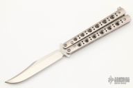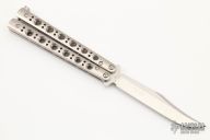 This Model 63 Balisong by Benchmade features a clip point blade with swedge. The handle has a skeletonized stainless steel construction over steel spacers, t-latch.  Comes with original box, sheath and papers.  Comes with original box, papers, and pouch. Prototype. Excellent condition.