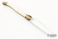 This knife features a mirror polished clip point blade with a single nail nick and a fileworked thumbrest.  The handle features brass bolsters/liners over a steel backspring and bone covers.  The back spring has "Dr. Valerie" engraved on it. Excellent Condition.