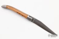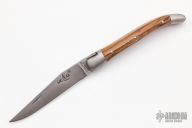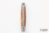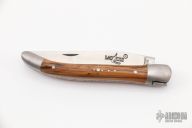 This knife features a bead blasted clip point blade with a single nail nick. The handle features steel bolsters/liners over a steel backspring and wood covers. Fileworked backspring. Excellent Condition.