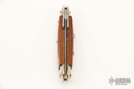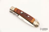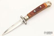 This swing guard auto features a dagger style blade with a single nail nick. The handle has nickel silver bolsters over brass liners and wood scales. Excellent Condition.