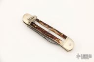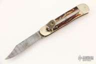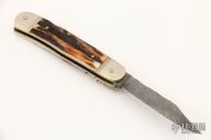 This Lever Lock Automatic by Hubertus Knives features a Damascus clip point blade with fileworked spine. The handle has nickel silver double bolsters and lever with stag scales over brass liners and steel backspacer. Has some patina and light scratches, otherwise excellent condition. This knife will not open all the way otherwise the knife is in good condition.