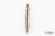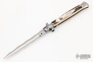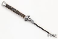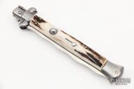 This swivel bolster auto by Italy features a tumbled and polished blade with a false top edge. The handle has stainless steel bolsters and butt, stag scales and brass liners. Strong opening. Has safety. Excellent Condition.