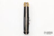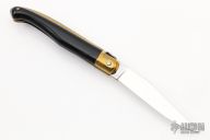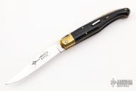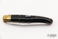 This G. David made Laguiole knife is a French design with great automatic action. It features a polished blade and black acrylic scales. Slide safety. The handle has brass bolsters and liners with rivet construction. Appearance is near mint, but the blade does have a bit of play in both directions.