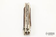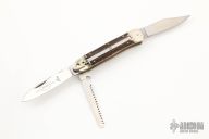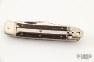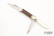 This Leverlock has a mirror polished stainless steel blades with nail nicks. Handle is stag antler with nickel silver bolsters over brass liners. Has 2 other blades, one is a saw the other a clip point. Both of these blades are slipjoints. The spring has been taken out of this knife.  This knife is not an automatic. Has some scratches, good condition.