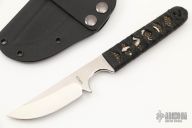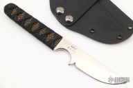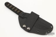 This Utility by Mickey Yurco features a satin finished blade with .120" blade thickness and .836" blade depth. The handle has black cord wrap over brown ray skin with a lizard menuki. Comes with a kydex sheath. Excellent condition.