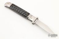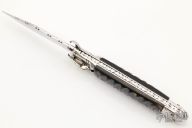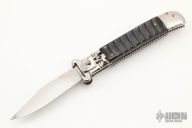 This Leverlock Auto by Indian Cutlery has a mirror polished stainless steel blade. Handle is buffalo horn with stainless steel bolsters over stainless steel liners. Shotgun shell pulling bolsters are marked "C12" and "C16". Great action and lockup. Has some scratches otherwise good condition.
