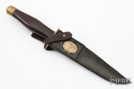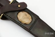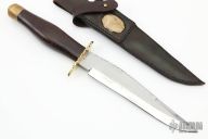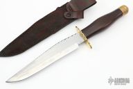 This Natchez Bowie from Kenneth Hills features a clip point blade, .206” blade stock and 1.37” blade depth, hidden tang construction. "Vine and Thorns" file worked blade spine. Guard and butt are brass. Handle is Wenge. It includes a brown leather sheath with a Biggs Canyon picture Jasper inlay.  New from maker.