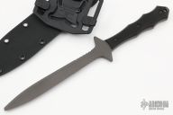 This knife by Masters of Defense features a bead blasted double edged blade with partial serrations and a full tang construction, .248" blade stock and .885" blade depth. The handle has black G-10 scales. Comes with a kydex sheath. Has a few light scuffs, otherwise excellent condition.