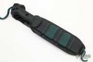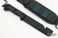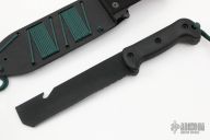 This Tactool from Becker Knife & Tool features a black chisel ground partially serrated blade with gut hook. The handle is comprised of black scales over full tang construction with lanyard hole in pommel. Comes with kydex sheath. Excellent condition.