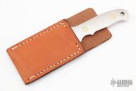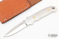 This fixed blade knife by Kansei Matsuno features a high polished blade, 3/16" blade stock, 7/8" blade depth. The tang is the handle and has brass insets. Rear of handle features a snap that snaps onto the included leather sheath and holds the knife in place. Nice work. Light table scratches and sheath marks on blade and handle.