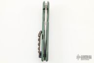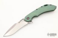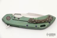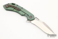 This Wayfarer 247H from Olamic Cutlery features a satin finished spear point blade, thumbhole, notched thumbrest and flipper. The handle is 'kinetic rainforest' finish titanium with floating and sculpted titanium backspacer and skulls pocket clip is positioned for tip up carry. . The Wayfarer 247 is very comfortable in the hand and flips well with no wrist action needed. Blade is centered when closed and locks up with no play. s/n T624H. Comes with original box and COA dated 8.6.21 . Excellent condition.