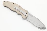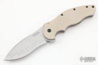 This 1850 Tyrade Assisted Opening Framelock Flipper by Kershaw has a CPM-D2/154CM composite blade. The handle is tan G-10 scales, black G-10 backspacer, steel liners and stainless steel tip down clip. Dead center blade seating, excellent lockup, zero blade play, and superb action. Excellent condition. Only 175 pieces were made in this configuration.