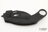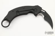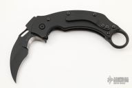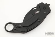 This Framelock Karambit from James Coogler features a black coated hawkbill blade with thumbhole and thumbramp. The handle features a black coated titanium frame, with black hardware, tip up pocket clip,carbonfiber ring at the pommel. Great blade seating, lockup is solid. Comes with an Extrema Ratio box. Excellent condition.