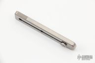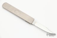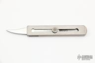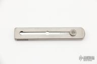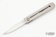 This knife by Gerry Jean features a hand-rubbed satin finish blade and a satin titanium handle. The blade slides in and out of the frame by pressing down on the slider and moving toward either end of the handle. The blade locks securely in the open and closed positions. Thumb and finger notches on handle. Has scratches, otherwise good condition. Comes with a leather pouch.