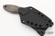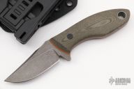 This Tusk by Tom Krein features an acid washed blade with .125" blade stock and 1" blade depth, full tang construction. The handle has green micarta scales with black linen micarta pins, aluminum lanyard tube and orange liners. Includes Kydex sheath with TekLok. New from maker!