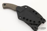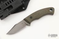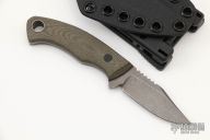 This Pocket Bowie by Tom Krein features a acid washed blade with notched thumbrest, .126" blade stock and .781" blade depth, full tang construction. The handle has green micarta scales with black liners and pins. Comes with a kydex sheath with TekLok.  New from maker.