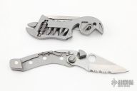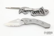 The T01 SpydeRench includes a real Spyderco knife with a locking full-sized, one-hand open/close knife blade and pocket clip. Investment-cast 17-4ph corrosion resistant stainless steel body. Features include: adjustable crescent wrench, a 2-setting slip joint pliers, a set of four screwdriver bits (including: a #2 and #3 Phillips-head as well as a #1 and #2 flat-head), and a diamond-coated file featuring a concave, convex and flat sharpening surface.