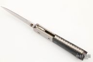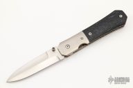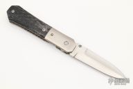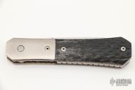 This coffin linerlock folder from Mel Pardue features a hand-rubbed satin finish dagger style blade with a false top edge, orange peel finished double dovetail bolsters, and jigged bone scales and jeweled titanium liners. Nice lockup, detent and blade seating. Excellent finish work. Comes with a soft pouch. Excellent condition.