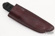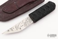 The Combat Kiridashi by Mike Snody features a satin finished chisel ground blade with carved/textured flats, .112" blade stock and 1.010" blade depth, hidden tang construction. The handle has black cord wrap over black paracord. Comes with a brown sheath with belt loop. Excellent condition.