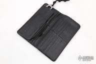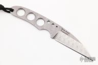 A fixed blade by Mike Snody features a Damasteel chisel ground blade with notched thumbrest, .140" blade stock and 1.183" blade depth full tang construction. The handle has the kydex sheath that is attached to an Infinity Leatherworks Rayskin wallet. Excellent Condition.