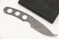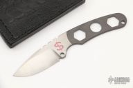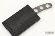 This knife by Mike Snody features a satin finished chisel ground blade with notched thumbrest, .124" blade stock and .927" blade depth. The handle is bead blasted with 1/2" hex wrench. Comes with black leather sheath with ostrich leg skin overlay. Excellent condition.
