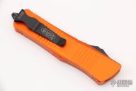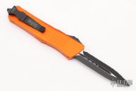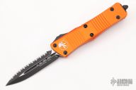 This Troodon by Microtech features a black blade with one fully serrated edge. The handle has an orange aluminum frame with black hardware and tip down clip. Dated 01/2022 and s/n 9538. Includes the original box and papers. Excellent condition.