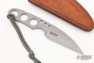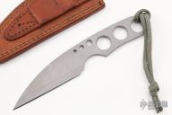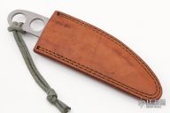 A fixed blade by Mike Snody features a bead blasted blade with notched thumbrest, .145" blade stock and 1.172" blade depth full tang construction. The handle has an acid etched pattern. Comes with a brown leather sheath. Excellent Condition.