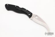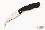 This Civilian Lockback Folder by Spyderco has a satin finished, fully serrated hawkbill blade with thumb hole. Handle is black G-10 with stainless steel backspacer/ lock, has a tip down clip. Excellent condition. Comes with a Spyderco zippered case.