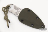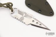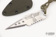 This small neck knife by Rob Dalton features a satin finished double edged blade, 1/8" blade stock and 3/4" blade depth. The handle has grooves for grip and a lanyard hole at the butt. Comes with a kydex sheath. Excellent condition.