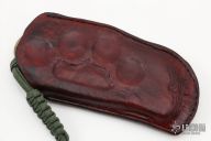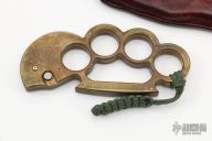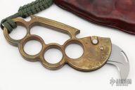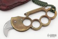 This Interrogator by Rob Dalton is a set of brass knuckles with a small claw automatic blade on the thumb side. Bead blasted blade with 1" cutting edge. 1 1/16" diameter finger holes. Made of brass for that heavy duty feel. Perfect function. Says "Interrogator" on handle. Has some scratches and patina, otherwise good condition. Comes with a custom brown leather sheath.