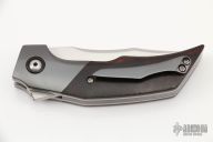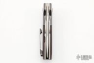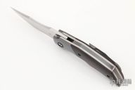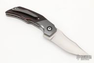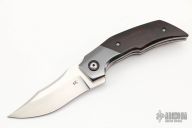 This Darkness by Chad Nell features a hand rub satin finish upswept, recurve blade with notched flipper. The handle has zirconium bolsters with iron wood pivot collars, desert ironwood burl scales, zirconium backspacer and tip up clip. Rides on bearings, nice detent, lockup and blade seating. Comes with zippered case and COA. Excellent Condition.