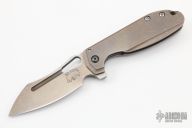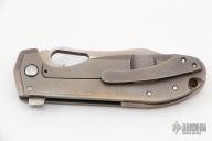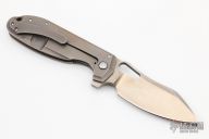 This H.S. Possum by Jason Stout and Jeremy Horton features a chisel ground bronzed blade with a fuller, thumbhole and flipper. The handle has a bronzed and tumble finished titanium frame with matching tip up pocket clip and an orange peel finished backspacer. Nice detent, lockup and blade seating. Has a couple light scuffs on the blade, otherwise excellent condition. Comes with a zippered case.