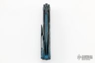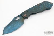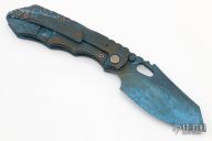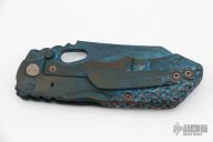 This Evolution by Custom Knife Factory features a heavy force patina finished blade with notched thumbrest and thumbhole. The handle has a carved and bark finished force patina finish titanium frame with a matching tip up clip and backspacer. Comes with velcro case and COA. LIGHT detent, lockup and blade seating. Knife can be shaken open. Otherwise in excellent condition. Customized by Stas Bondarenko.