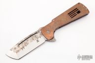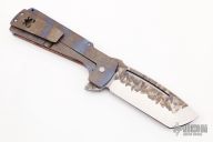 This Grim Reaper flipper by RichMade Knives features a tanto blade with a flipper. The handle has a copper and titanium frame with titanium tip up pocket clip.  Aluminum backspacer. Nice blade seating, detent and lock up.  Comes with zippered case and COA, dated Feb 10, 2019..  Excellent condition.