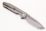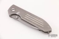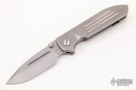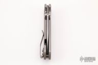 This Dauntless MK1 by T.A.D. Gear features a bead blast finished spear point blade with swedge, fullers, dual thumb studs and notched thumb rest. The handle has a milled and tumbled titanium frame over a notched titanium backspacer. The bead blasted titanium deep carry clip is positioned for right hand, tip up carry. Comes with a zipper case. Has marring on the pivot hardware. Otherwise in excellent condition.