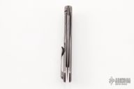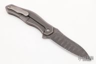 This Exo flipper from Gerry McGinnis features a Chad Nichols Elmax core San Mai Damascus blade with notched thumbrest and flipper. The handle has a milled and tumbled titanium frame with a tumbled titanium backspacer and tip up clip. Smooth and fast flipper opening that requires no wrist action. Nice blade seating, detent, and lockup. Excellent condition. This piece was made for the 2018 TKI. Comes with a zippered case. #014 and dated 1/24/18