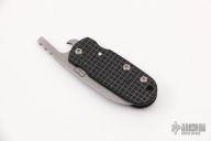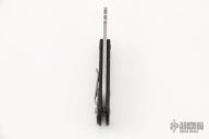 This friction folder features a bead blast wharncliffe blade with bottle opener on friction bar. The handle has a black G-10 frame with Frag pattern and titanium barrel spacers. Dated 2014. Mint condition.