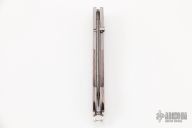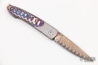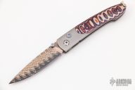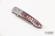 This B10 Blue Wave by William Henry features a Copper Wave San-Mai Damascus with VG-5 Core blade with single thumbstud with Kashmir blue topaz inlay. The handle has a titanium frame with heat-blued wave mokume inlay, topaz inlay push button, and sterling silver lanyard bail. Comes with original box, sheath, and papers. Excellent condition.