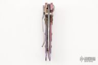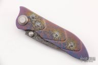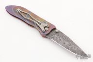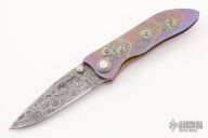 This linerlock by Allen Elishewitz features a Damascus blade with a dual thumbstuds. The handle has splatter anodized titanium scales, anodized titanium liners and black barrel spacers. Strong lock up, and nice detent. There is some light spotting on the blade spine near the tip. The blade favors the right side of the frame. Comes with original nylon sheath. Good condition.