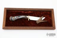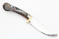 This knife by Ted Miller features a mirror polished blade with .124" blade stock and 1.243" blade depth, hidden tang construction. The handle has a brass guard and a carved crown stag grip with jasper and turquoise inlays.  Comes with a wooden and stag display. Comes with COA. Excellent condition. #2285.