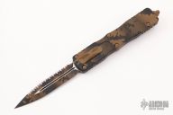 This Dirac Delta OTF automatic by Microtech features a D/E Coyote Camo finished blade with a fully serrated edge. The handle is coyote camo aluminum with a stainless steel tip down clip. Serial number 038 and dated 12/2021. Comes with original box and papers. Excellent Condition.