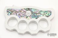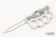 This Custom K-Razor by Burn Knives features a mirror polished double-edged blade with satin flats. The handle has a 7075 alloy aluminum knuckle frame with abalone inlays. Has a couple light scratches, otherwise excellent condition.
