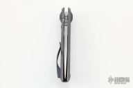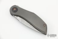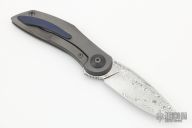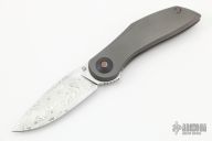 This knife from Alexander Cheburkov features a drop point ZDP 1016 Damascus blade with swedge, notched thumb rest and flipper. The handle has a milled titanium frame with matching tip up clip and backspacer. Great blade seating, detent and lock up. Includes original box and papers.  Excellent condition.