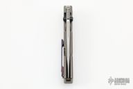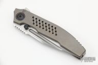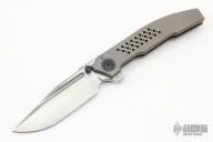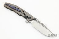 This Snafu 3.0 Integral Flipper by Custom Knife Factory is a Peter Rassenti design, it features a two-tone blade with notched thumbrest and flipper. The handle has a bead blasted and anodized titanium frame and tip up timascus clip, timascus pivot collars. Rides on bearings, nice detent, lockup and blade seating. Has a stainless lockface insert. Comes with zippered case. Excellent Condition.