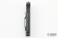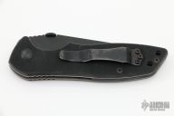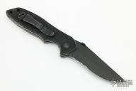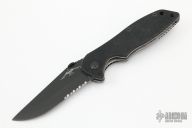 This Mach-1 by Emerson Knives features a black partially serrated blade with thumb disc and notched thumbrest. Textured black G-10 scales over titanium liners, black tip up stainless steel clip. Dated 2000. Has a couple light scuffs, otherwise excellent condition.